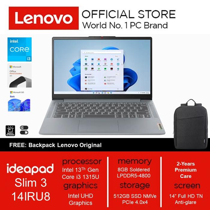 LAPTOP LENOVO IDEAPAD SLIM 3 14IRU8 CORE I3 1315U RAM 8GB 512GB SSD WINDOWS 11+OHS 14" FULL HD - ARTIC GREY, UNIT LAPTOP