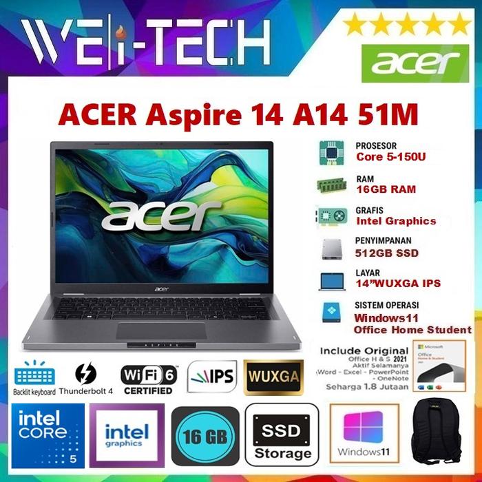 ACER ASPIRE 14 A14-51M CORE 5-120U 16GB 512GB SSD 14"WUXGA IPS WIN11 OHS - GREY, TANPA ANTIGORES