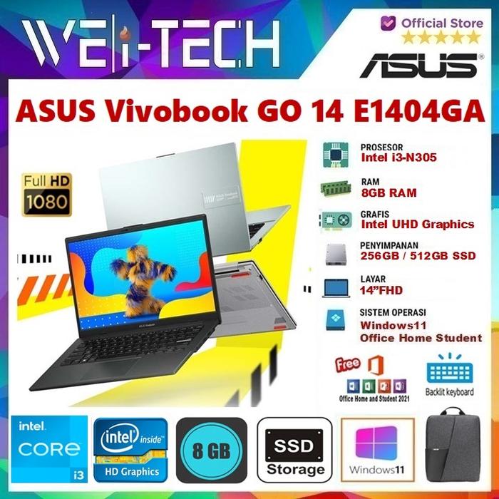 ASUS VIVOBOOK GO 14 E1404GA I3-N305 8GB 512GB SSD 14"FHD WIN11 OHS - BLACK-256GB, TANPA ANTIGORES