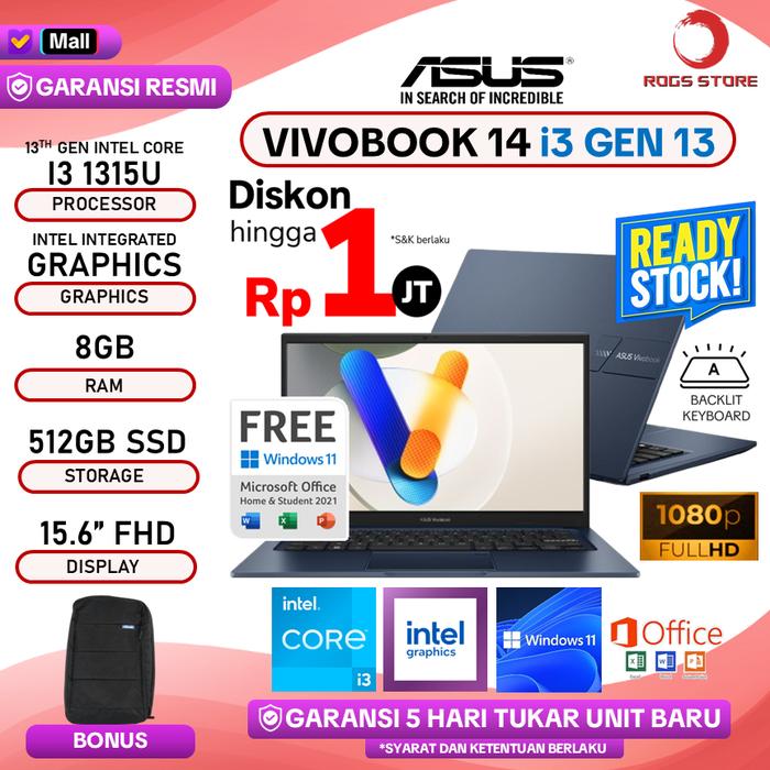 LAPTOP ASUS VIVOBOOK 14 CORE I3-1315 8GB 512 SSD W11 OHS 14"FHD - A1404/A1404VA - STANDARD, 8GB 256GB