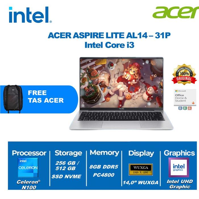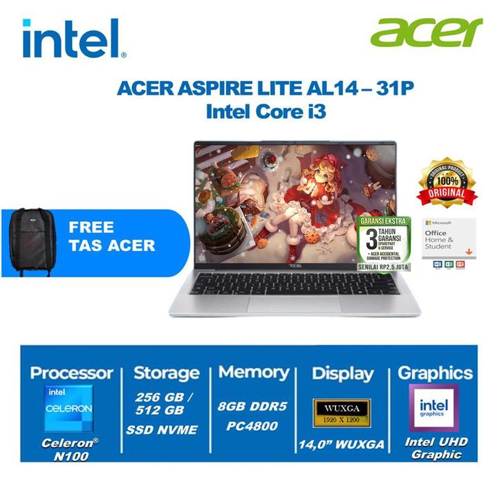 ACER ASPIRE LITE AL14 31P - INTEL N100 8GB 512GB SSD 14" WUXGA IPS W11 - NON BUNDLE, WINDOWS 11 HOME