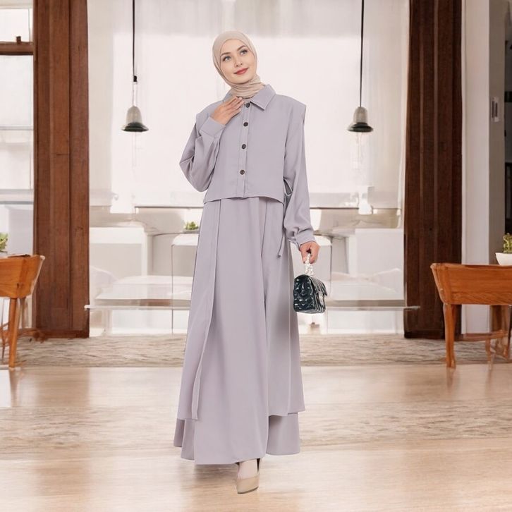Set Baju Gamis Muslim Wanita Size S M L XL Setelan Dress Plus Rompi Vest Casual Outfits
