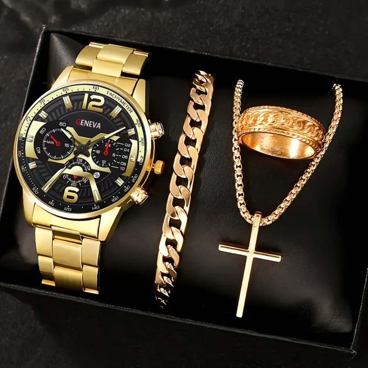 4PCS Jam Tangan Kuarsa Pria Gaya Bisnis Tali Baja Dial Besar Jam Tangan Mode Gelang Kalung Set Cincin Gratis (Tanpa Kota