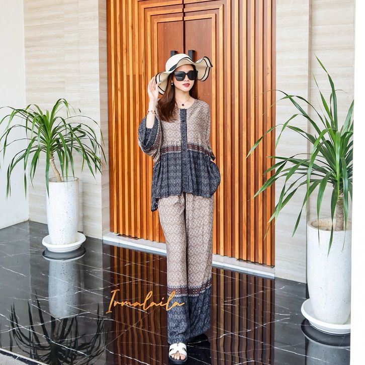 One Set Blouse Kancing Tangan Karet dan Kulot Rayon Wanita Nyaman Cantik Kekinian Busui Friendly