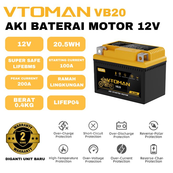 VTOMAN VB20 Aki Motor 12V Baterai Starter Motor 125cc-150cc | Baterai Kering | Motor Matic & Bebek | Ringan