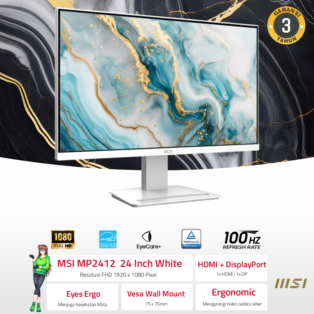 Monitor MSI MP2412W 24" 100Hz Full HD 1ms 110 PERSEN sRGB HDMI DisplayPort Monitor Putih