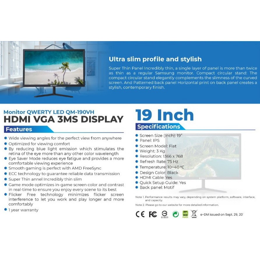 Qwerty QM-190VH LED 19 Inch HDMI VGA - LCD Led Monitor 19"