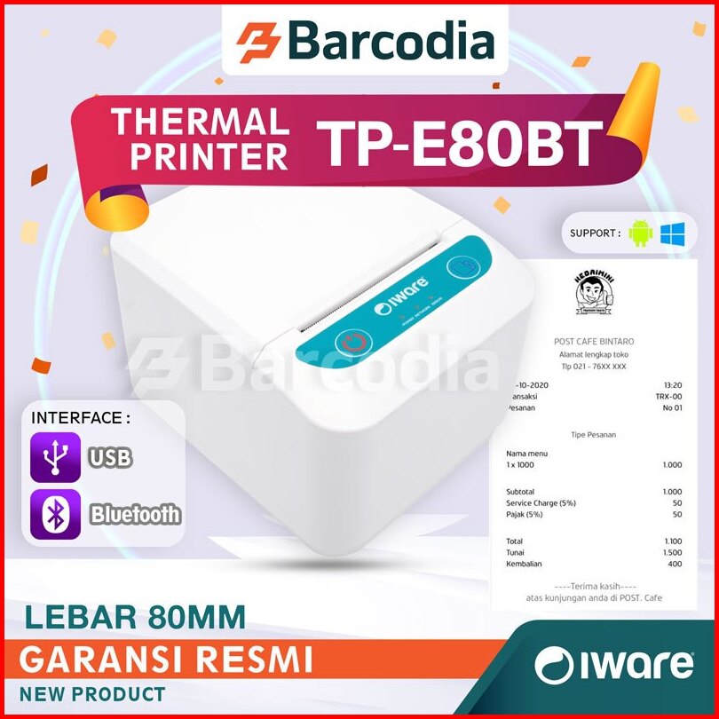 Barcodia Printer Thermal Struk 80mm Iware E80 Usb Bluetooth Rj11 Putih