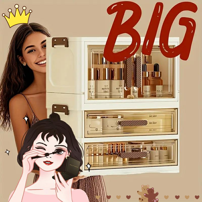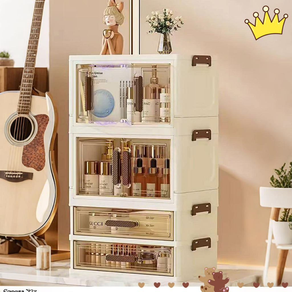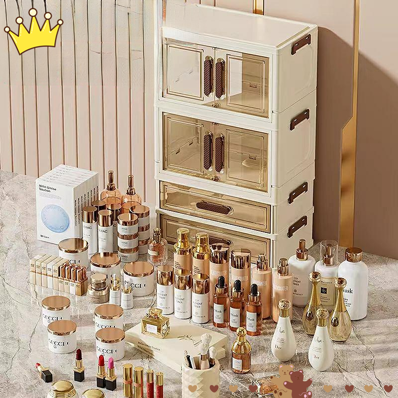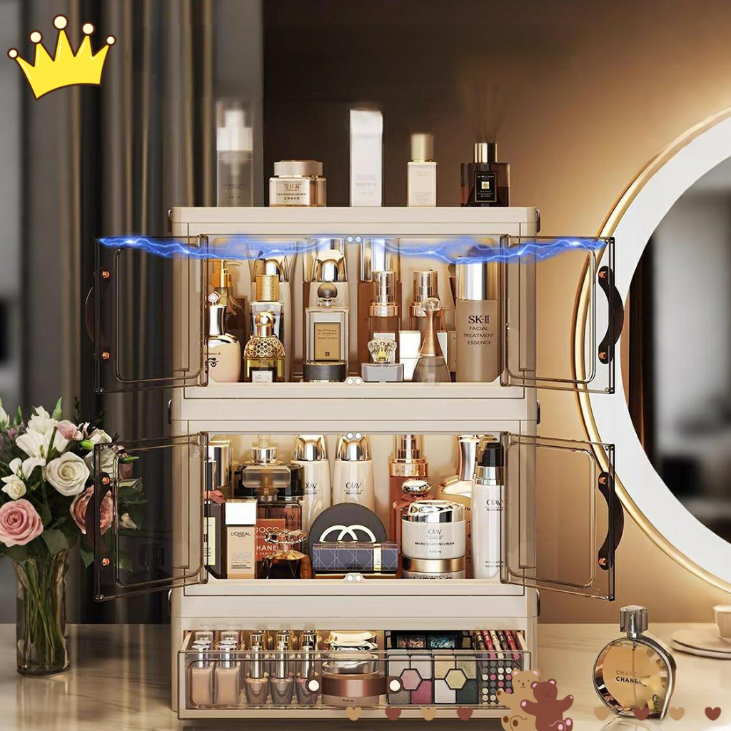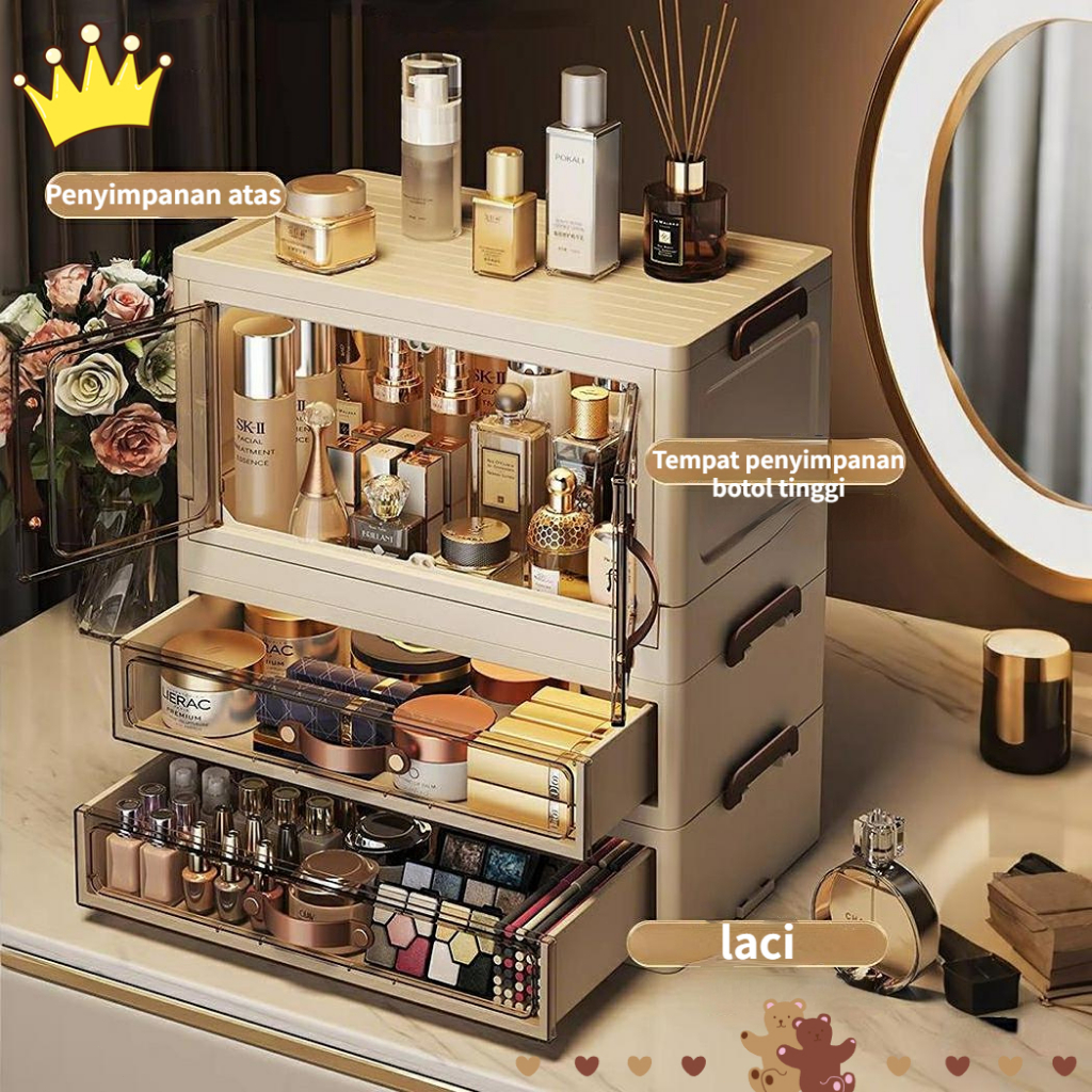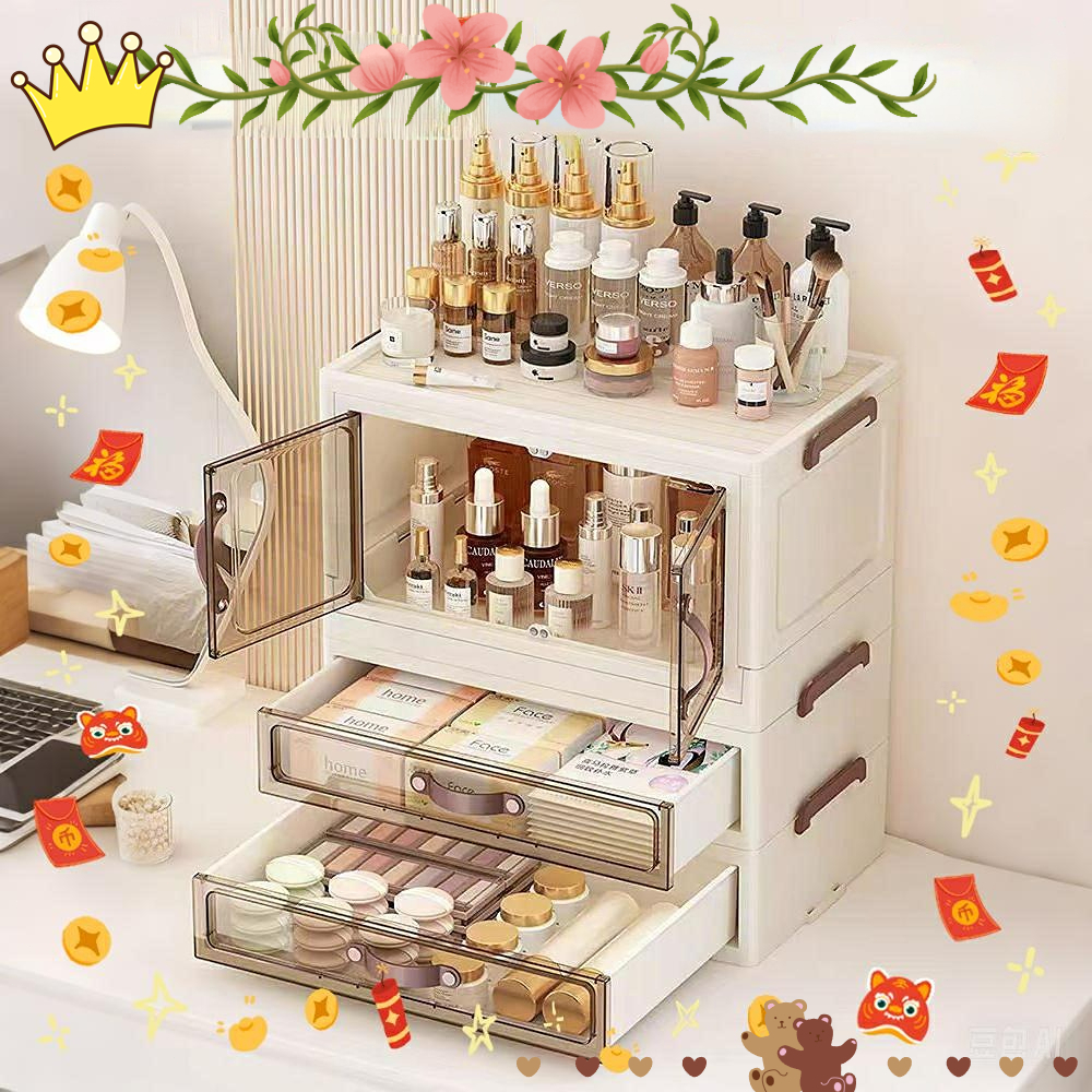 penyimpanan Kotak kosmetik desktop tahan debu dengan laci, meja rias, kuas makeup, lipstik, rak penyimpanan masker