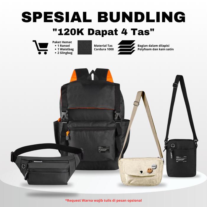 PUSHOP PAKET BUNDLING HEMAT PSHP120K-03 - PAKET TAS PRIA WANITA 120 RIBU DAPAT 4PCS TAS RANSEL SEKOLAH, SLINGBAG DAN WAISTBAG TERBARU COWOK CEWEK HITAM BACKPACK - SESUAI GAMBAR