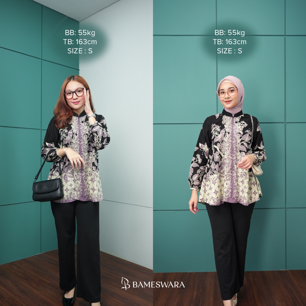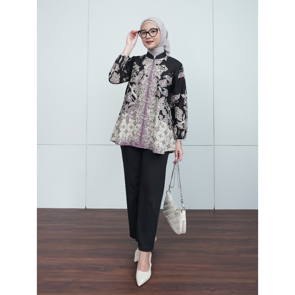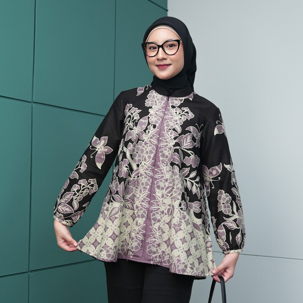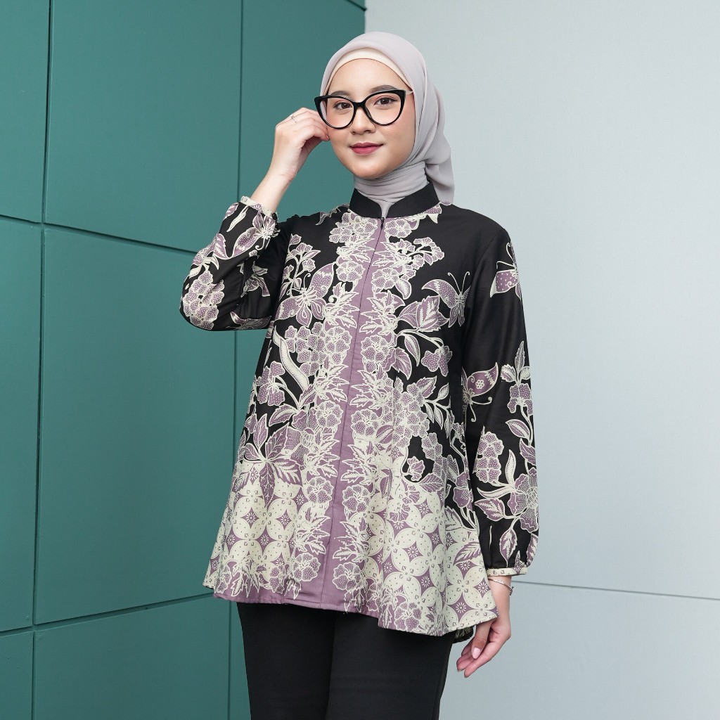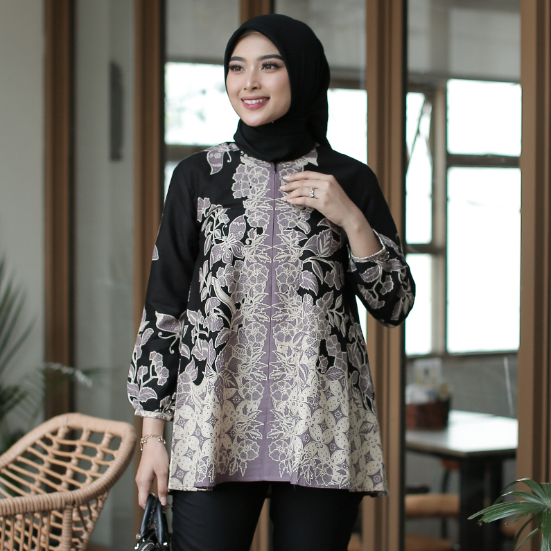 Batik Wanita Blouse Kerja Modern Kekinian Katun Resleting Depan Hitam Pastel