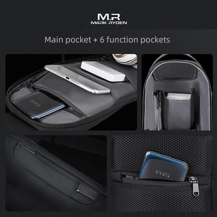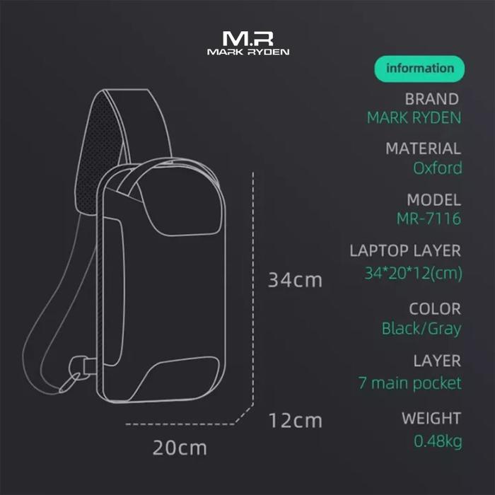 TAS SELEMPANG MARK RYDEN MR7116 ORIGINAL SLING BAG ANTI MALING TSA USB - HITAM