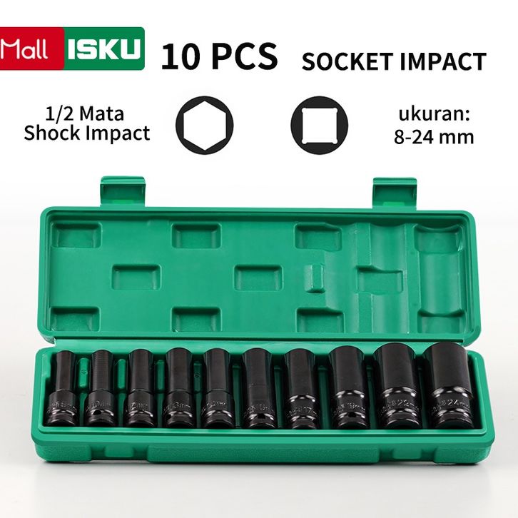 PROMO ISKU 10Pcs Mata Socket 8-24mm 1/2 Inch 6Pt Socket Impact Panjang 8-24mm Bahan Cr-V Impact Socket 10pcs Kunci Sok