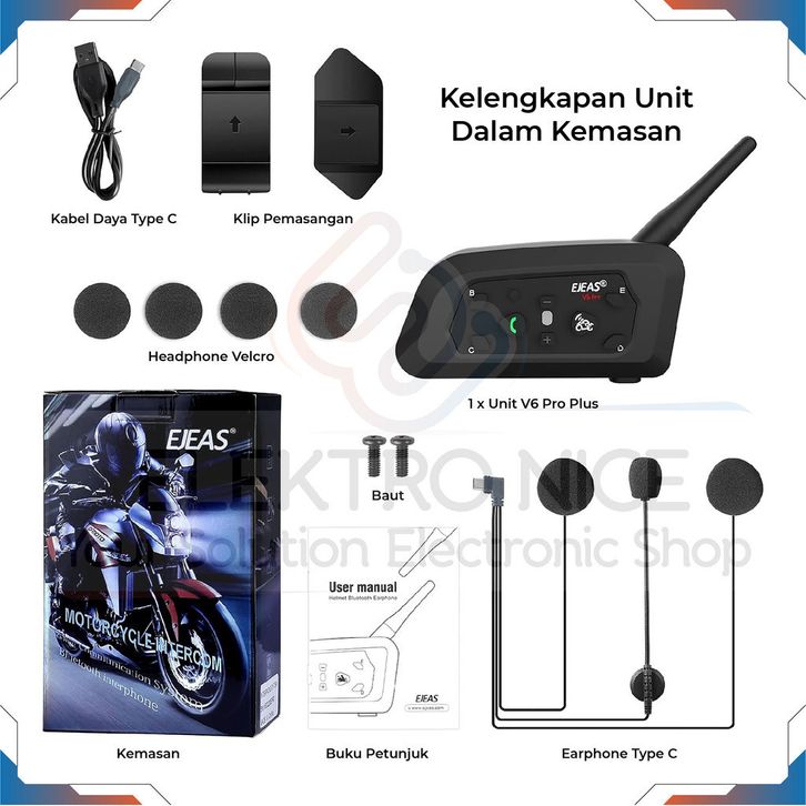 EJEAS V6 PRO+ PLUS HELMET BLUETOOTH INTERCOM 100 ORIGINAL FULLSET BERGARANSI