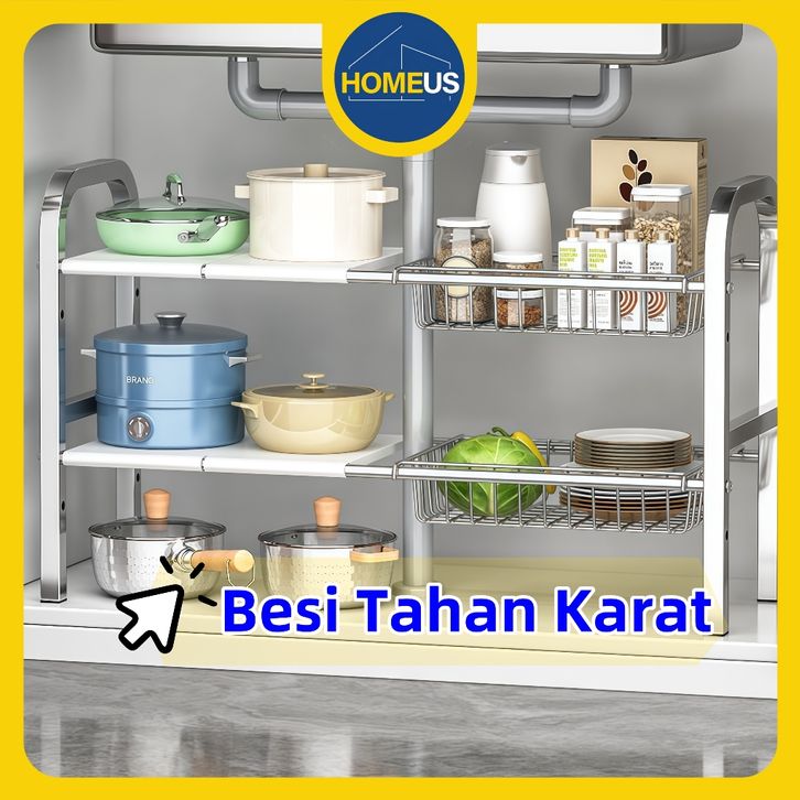 Homeus Rak Dapur Stainless Steel yang Dapat Diperluas Rak Dapur Dapur Rak Panci Rak Wastafel Rak Serbaguna