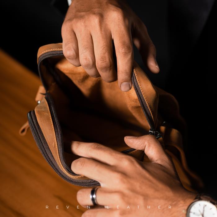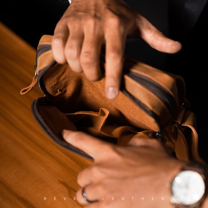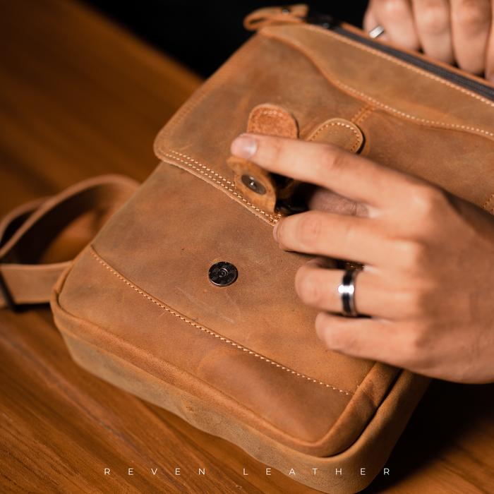 TAS SELEMPANG PRIA SLING BAG PRIA REVEN STEINER TAS KULIT PRIA ASLI - COKELAT
