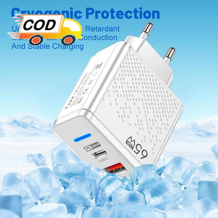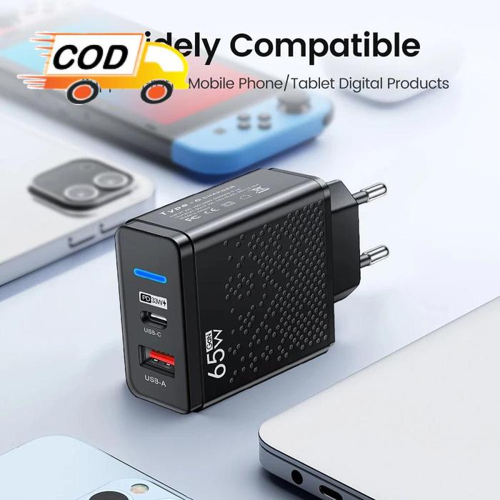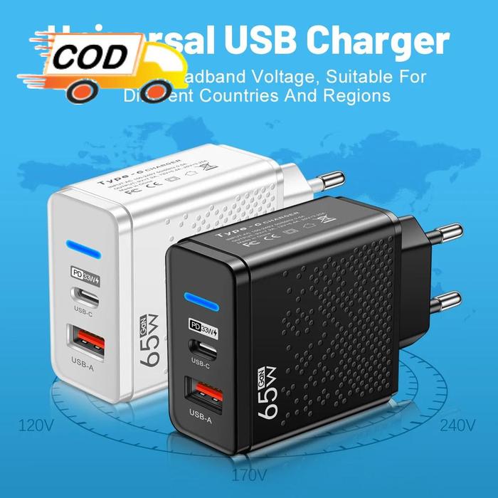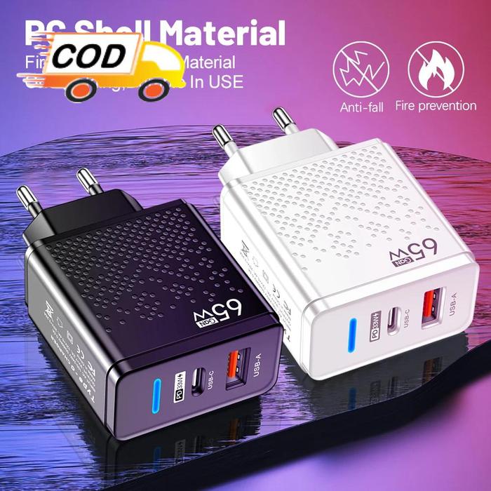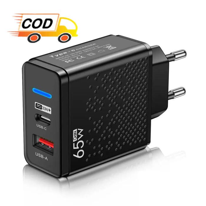 GRATIS ONGKIR ! KEPALA CHARGER GANDA DUAL PORT USB TYPE A & C UNIVERSAL 65W CEPAT FAST CHARGING - HITAM ORI
