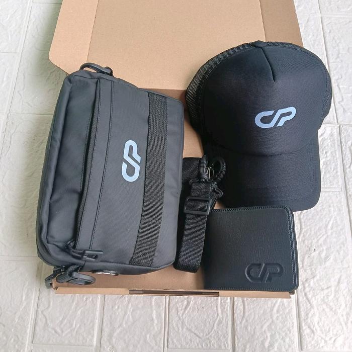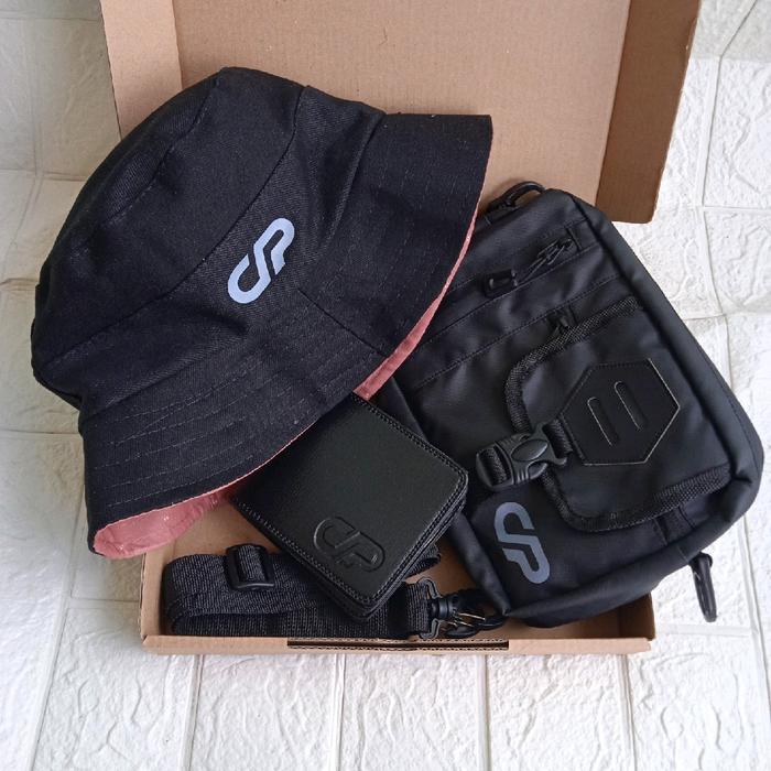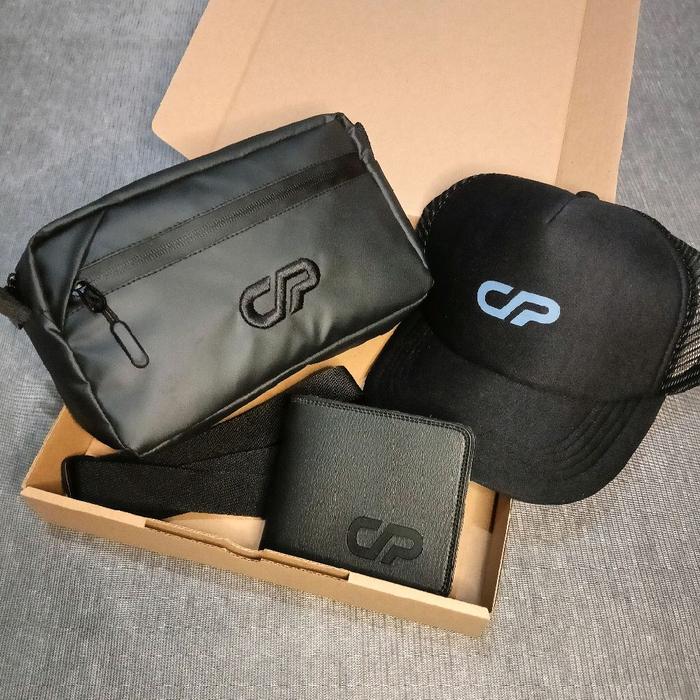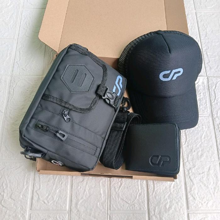 (PAKET HAMPERS) COMBO HEMAT TAS SELEMPANG + TOPI + DOMPET EKSLUSIF CLASSIC PROJECT INCLUDE BOX KADO PRIA WAISTBAG MINIMALIS TOSCA - HAMPERS 01