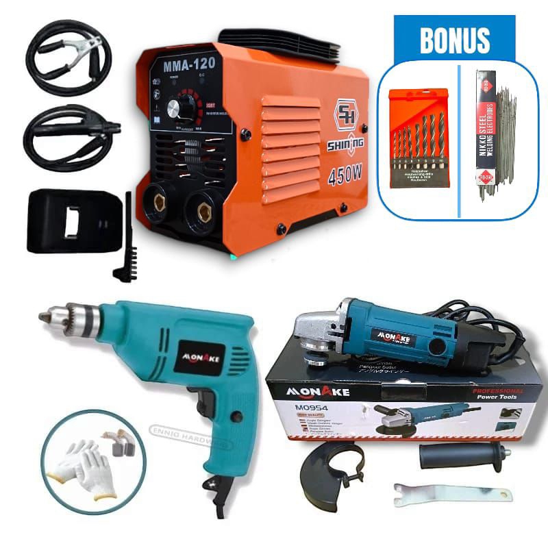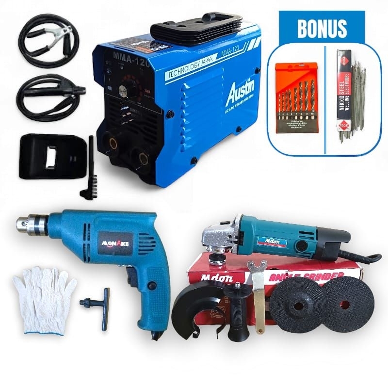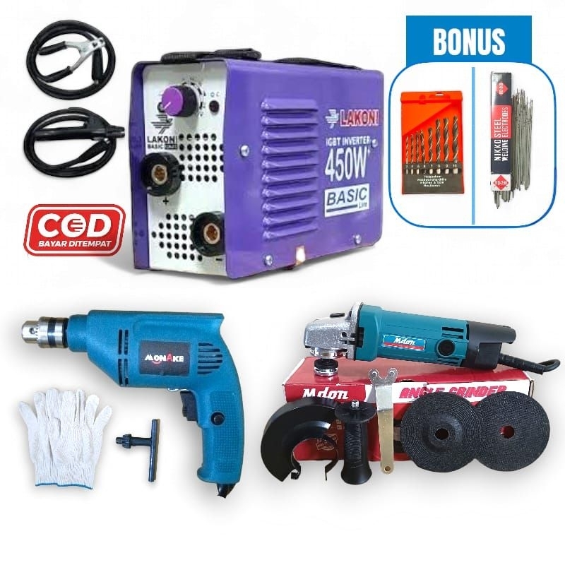 PAKET MURAH Travo Las LAKONI 450W / BONCHI / Austin /Shining + Gerinda 4" MDON/ MONAKE + Bor Listrik 10mm Monake Bonus m