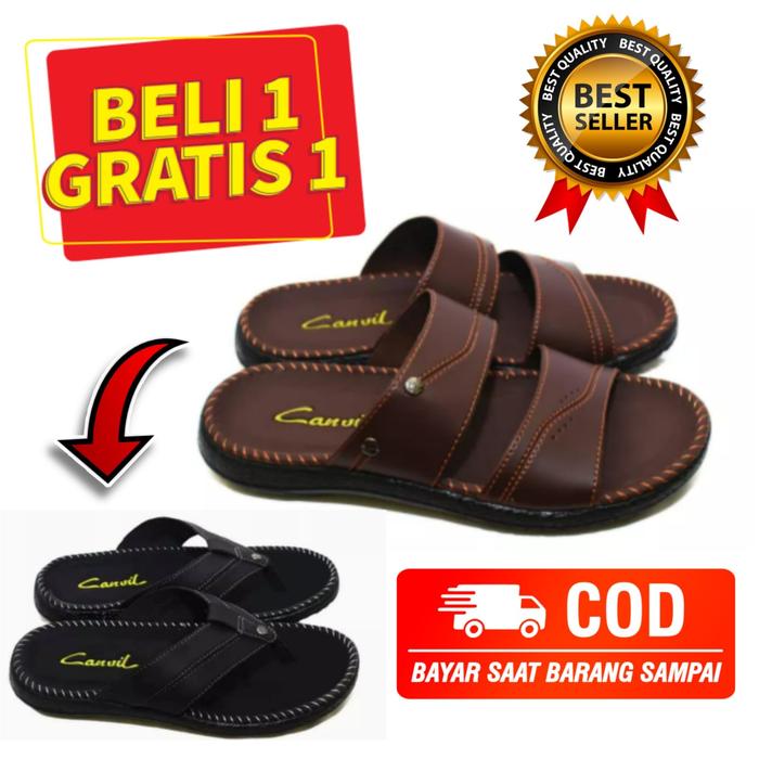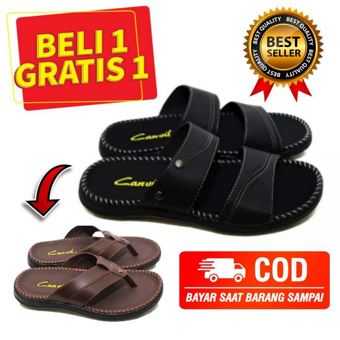 SANDAL PRIA COWOK CASUAL BELI 1 GRATIS 1 PROMO SENDAL SLOP KULIT PRIA JAPIT SLOP SELOP JEPIT - SELOP HITAM&SELOP COKLAT, 39