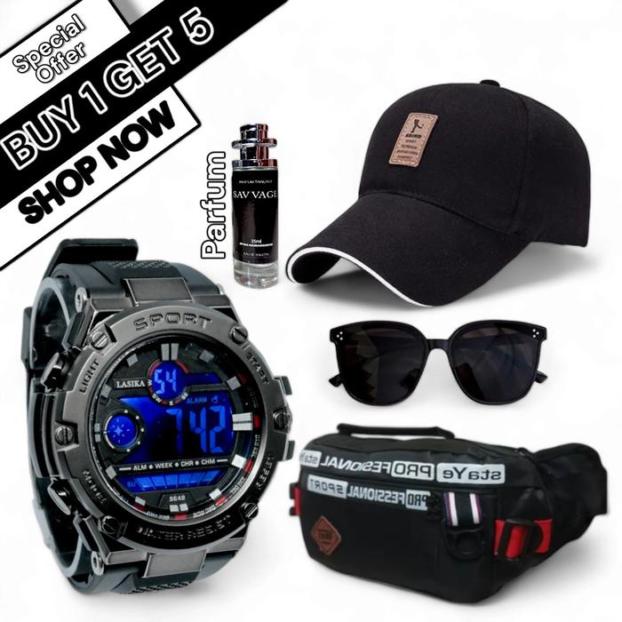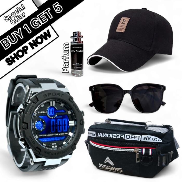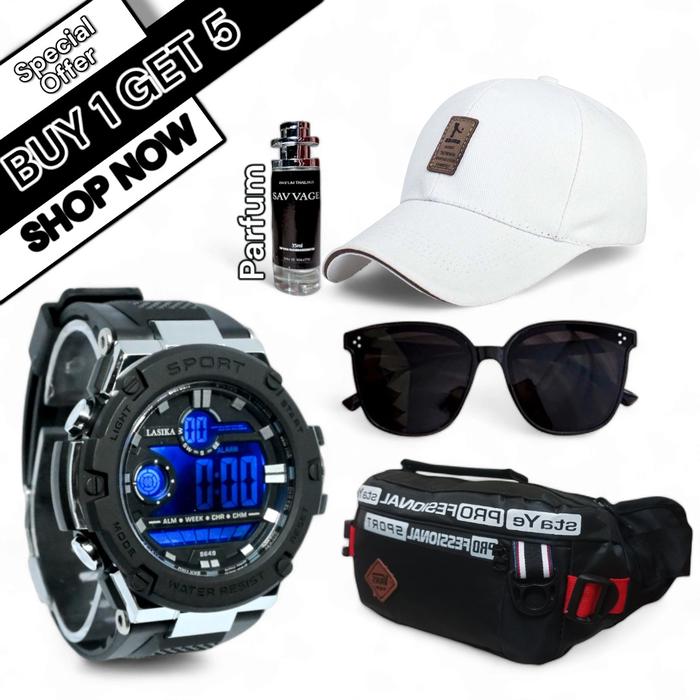 JAM TANGAN DIGITAL SPORTS WATCH ANTI AIR PAKET BUNDLING BELI 1 DAPAT 5 ITEM | WATER RESIST TAS SELEMPANG COWOK EXTENDED TOPI BASEBALL - LAS28BLACK 1