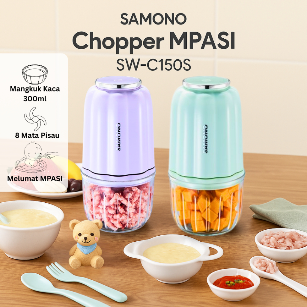 SAMONO Chopper MPASI 300ml Pelumat Penggiling Pemroses Makanan Bayi 200 Watt Mangkuk Kaca8 Mata Penghaslus Bumbu Daging