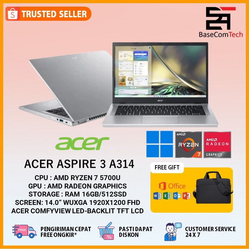 ACER ASPIRE 3 A314 | AMD RYZEN 7-5700U | 16GB/512GB | 14.0 INCH FHD IPS | WINDOWS 11 + OFFICE 2021.