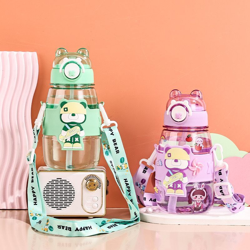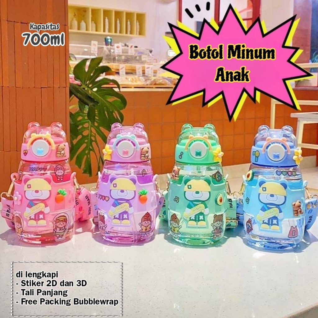 Botol Minum Anak Sekolah SD TK Free Stiker 2D dan 3D Korea Lucu + Tali Panjang dan Sedotan Bpa Free