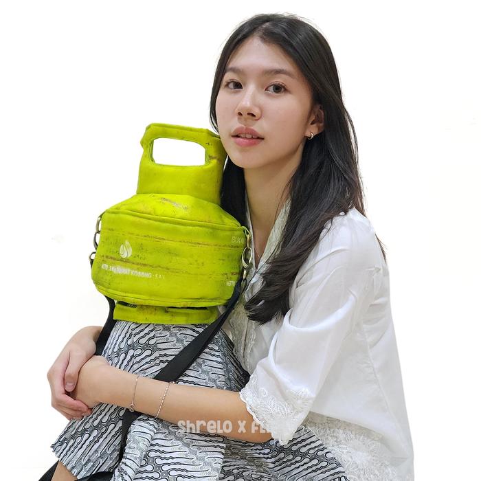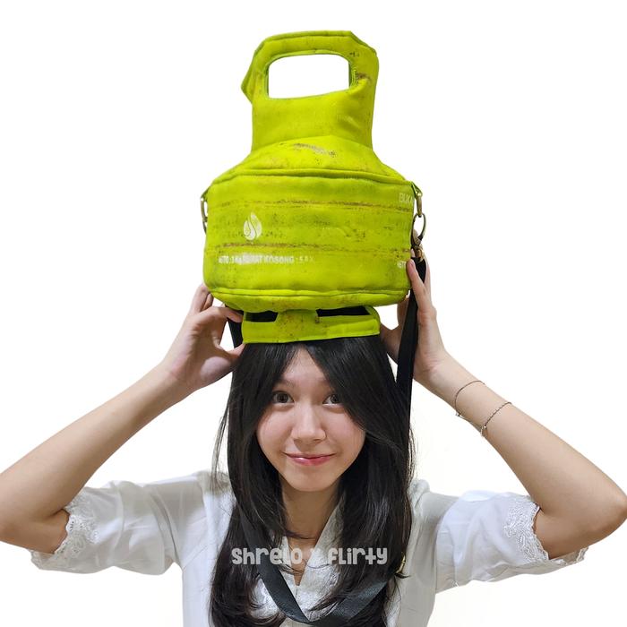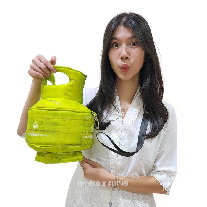 TAS BENTUK TABUNG GAS HIJAU LPG IJO MELON 3 KG FORMAT SELEMPANG SHOULDER BAG SHRELO KADO KOCAK UNIK MODEL FASHION SHOW KONTEN KREATOR BUATAN INDONESIA KREASI LOKAL