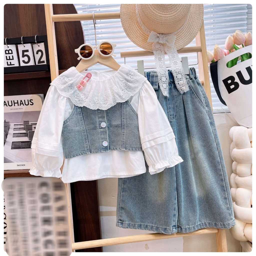 SETELAN ANAK CEWEK 3IN1 BLOUSE + ROMPI KANCING + CELANA JEANS SIZE 100-140