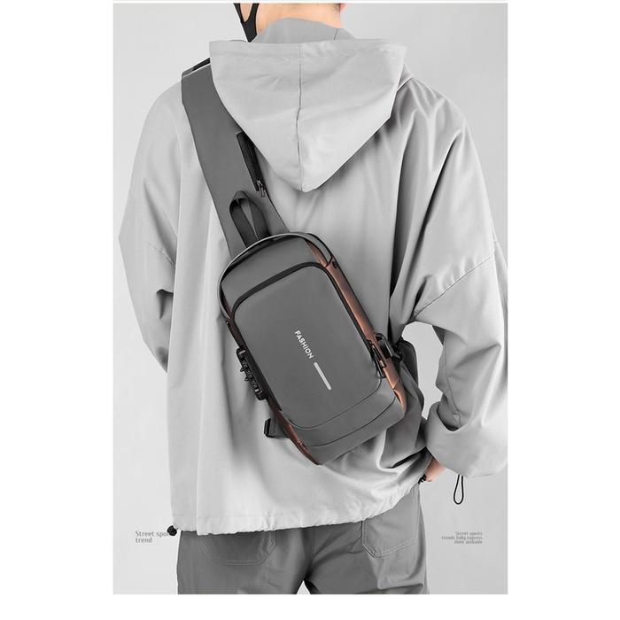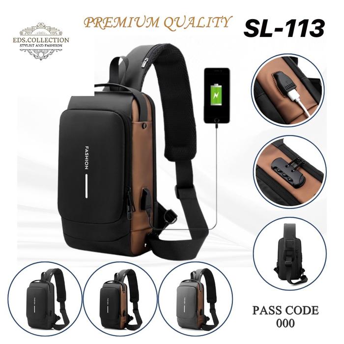SL113 - TAS SELEMPANG PRIA ANTI MALING USB CHARGER – SLING BAG WATERPROOF DENGAN SLOT KUNCI & KOMPARTEMEN MULTIFUNGSI | TAS DADA STYLISH - FULL-BLACK