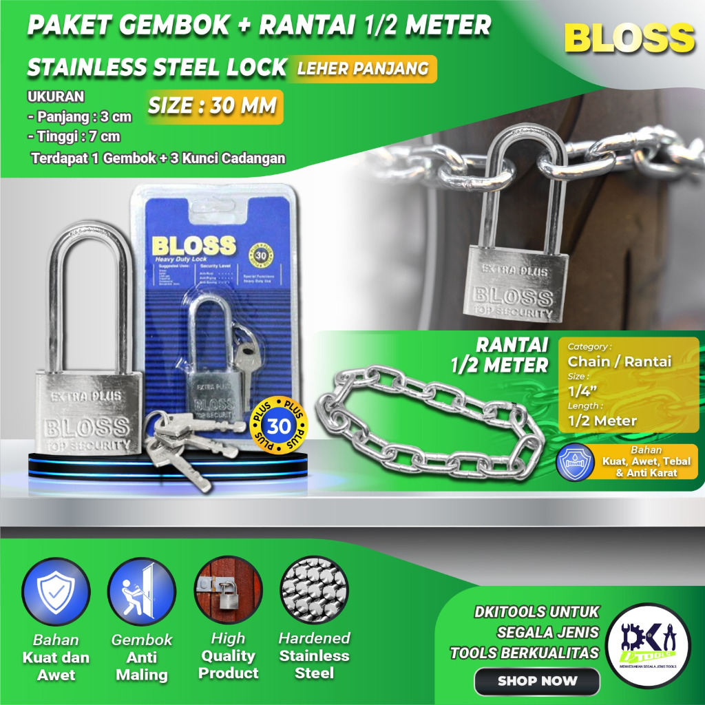 BLOSS Paket Gembok 30mm Panjang + Rantai 1/2 & 2 & 5 Meter Kuat Anti Karat & Tebal 1/4 Inch