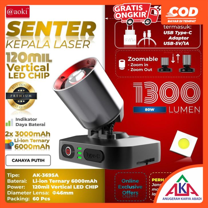 AOKI Senter Kepala 60W 80W Headlight / Professional Headlamp Zoom Army Lithium Rainproof IP65 Putih Kuning BY ORIGINAL
