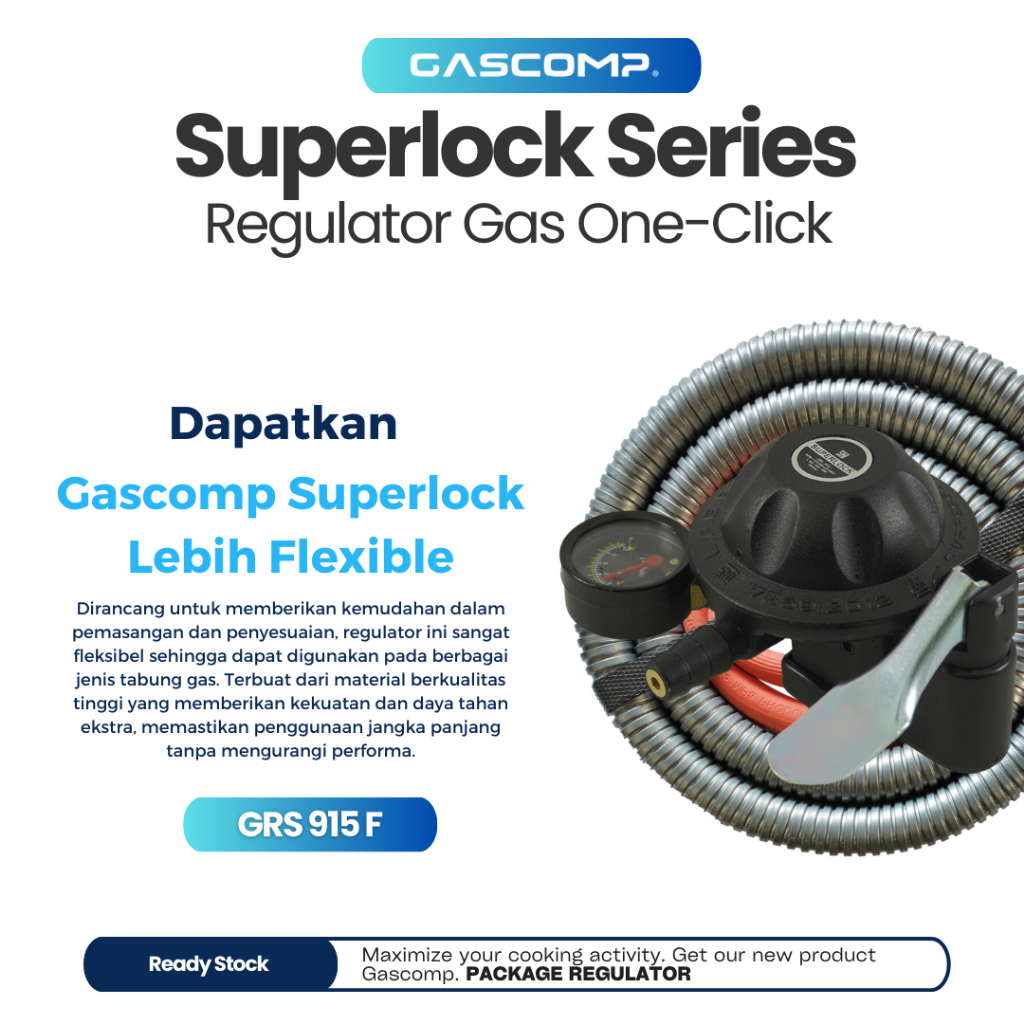 Regulator Gas Low Pressure Superlock dengan Selang Flexible Hitam 5 Lapisan Kuat dan Awet Selang Anti Bocor Gascomp