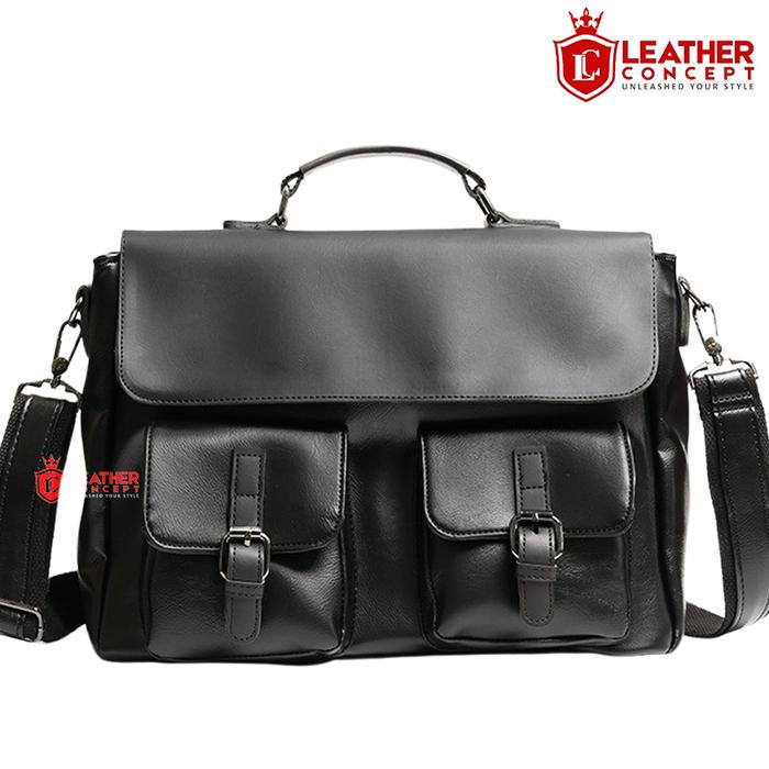 LEATHER CONCEPT TESLABLACK TAS SELEMPANG KULIT PRIA TAS COWOK TAS SLEMPANG KANTORAN TESLA BLACK