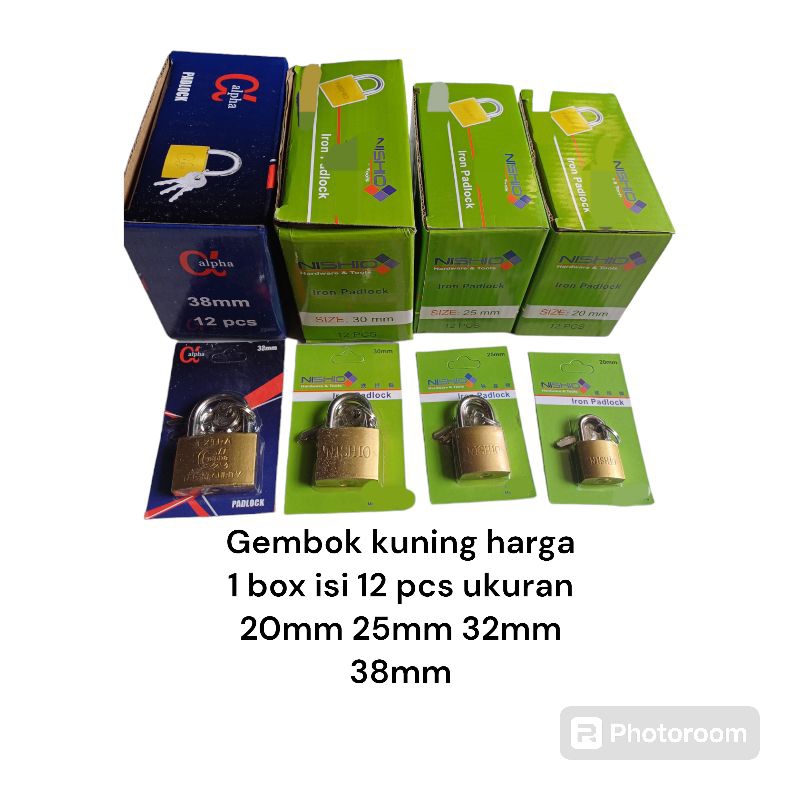 1lusin gembok kuning 20mm 25mm 30mm 38mm grosir harga 1 box isi 12pcs gembok per kuning murah
