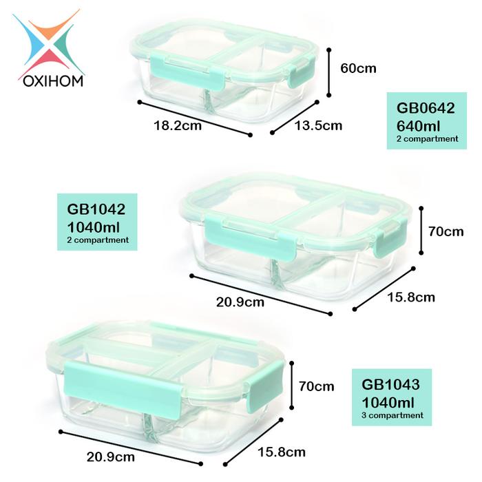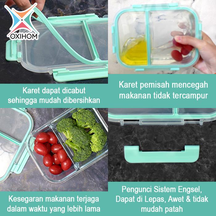 Oxihom Kotak Tempat Makan Kaca Glass Food Container Sekat Pemisah GB Wadah Kitchenware - 1040mL 2 Sekat Biru Tosca