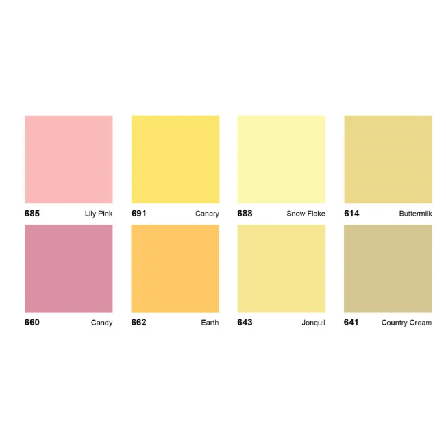 670 IVORY, 663 AZURE, 683 SWEET BLUE, 662 EARTH, 691 CANARY, SW SUPER WHITE, 624 M WHITE, 681 COOL DREAM, 694 ABU ABU, 641 COUNTRY CREAM