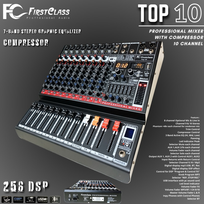 Mixer Firstclass Top 10 Top10 10 Chanel Efek Digital Reverb 256dsp Compress USB Bluetooth