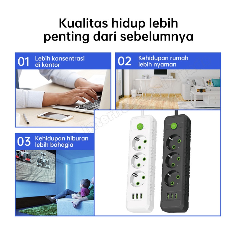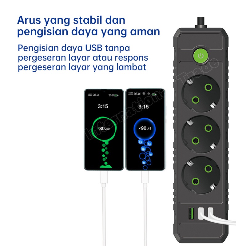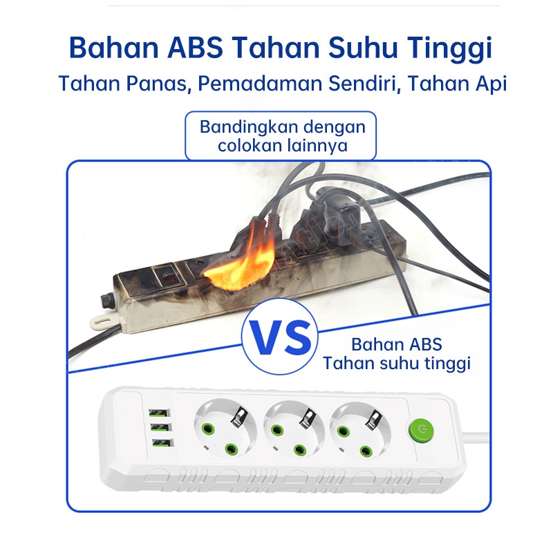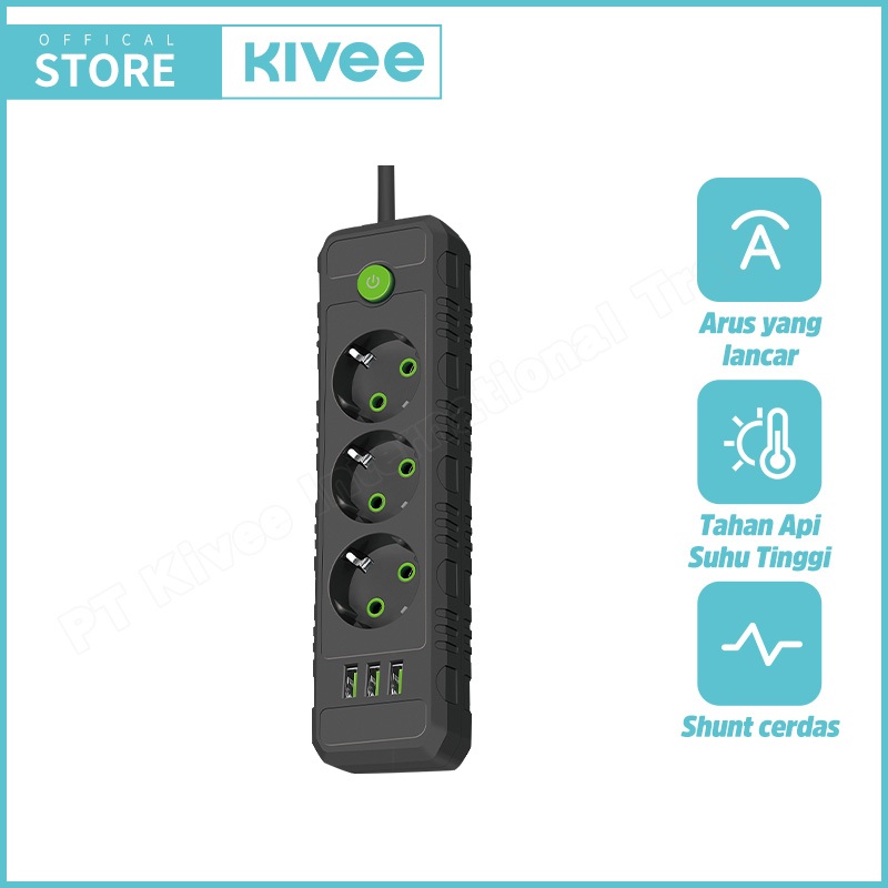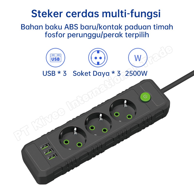 (HOT)KIVEE Stop Kontak 6-in-1 Colokan listrik 3 lubang USB+Type C Fast charging Max 2500W kabel 2M