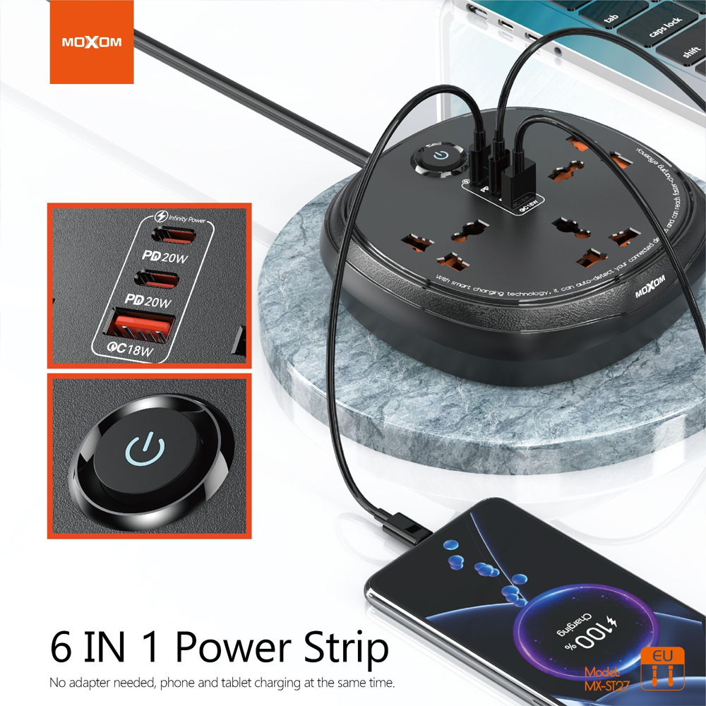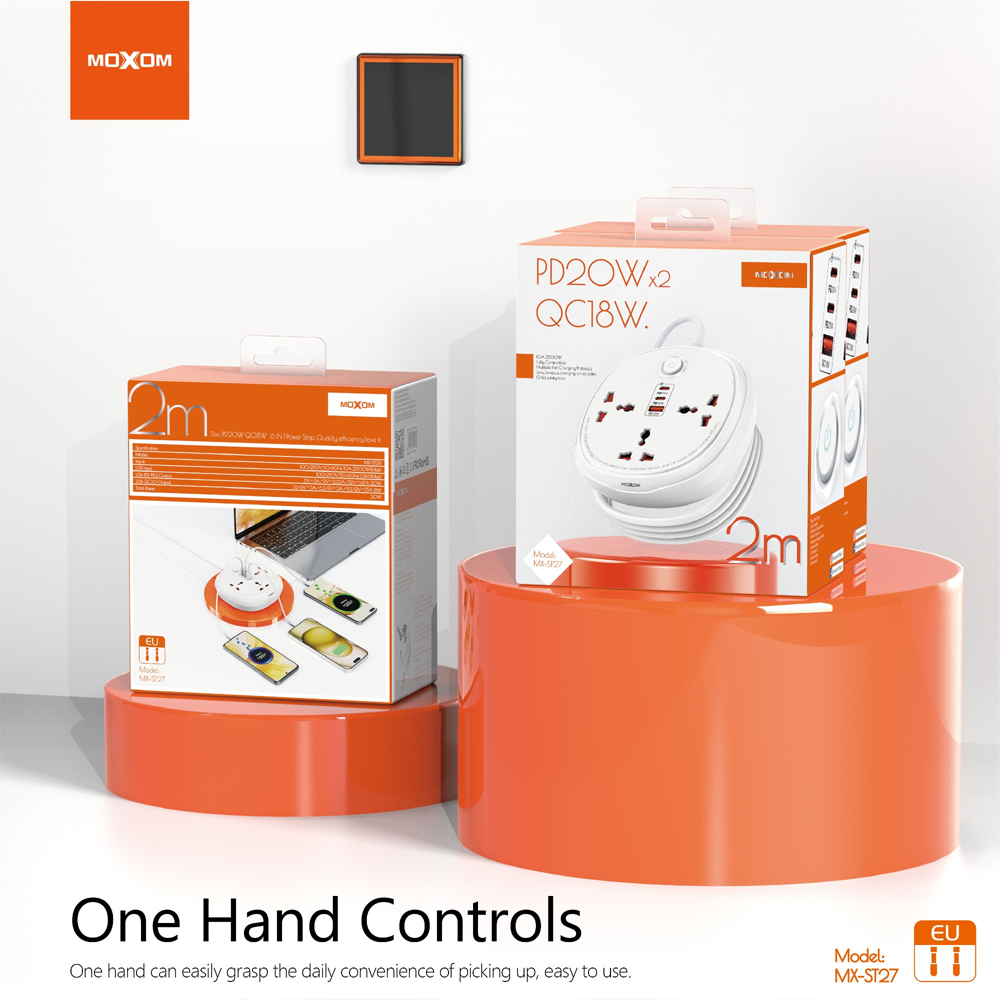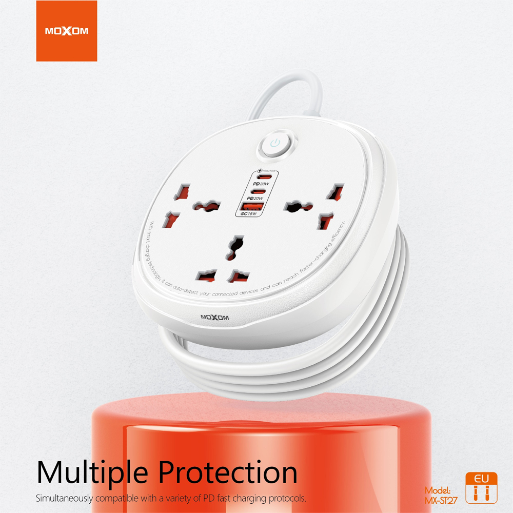Moxom Power 3 Socket 2PD 20W + 1USB 18W Power Botton 2500W Smart IQ 2Meter MX-ST27
