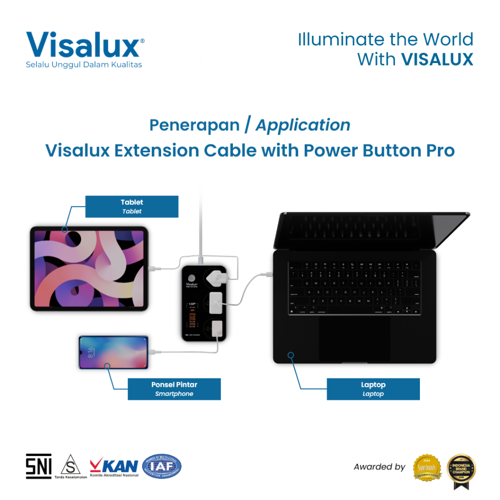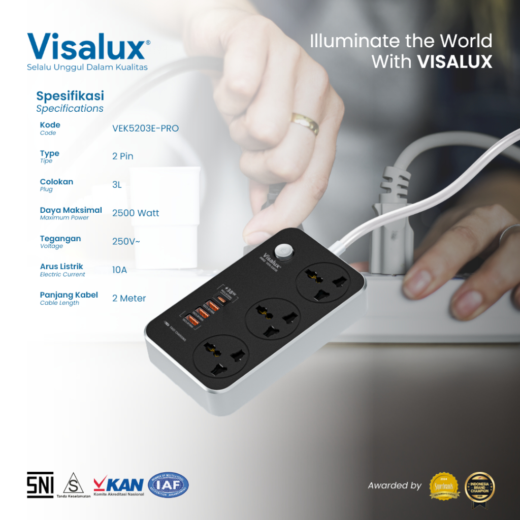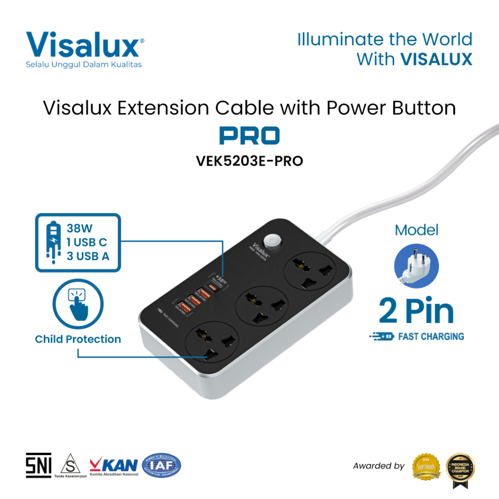 Visalux Kabel Extension with Power Button Pro (2 Pin) Type C + USB A Fast Charging - 3L (Stop Kontak 3 Lubang Colokan K