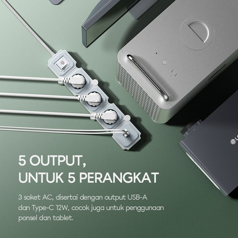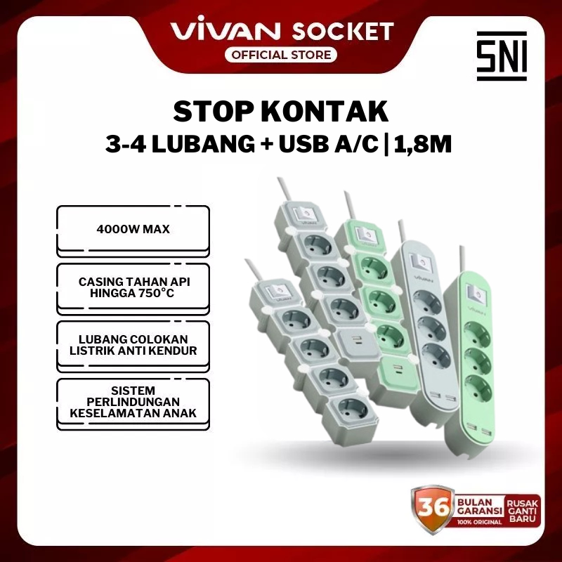 VIVAN Safety Socket Stop Kontak + Kabel 1.8 Meter dengan 3-6 Lubang USB A + Type C Adaptor Steker Power Strip VPS-H PRO