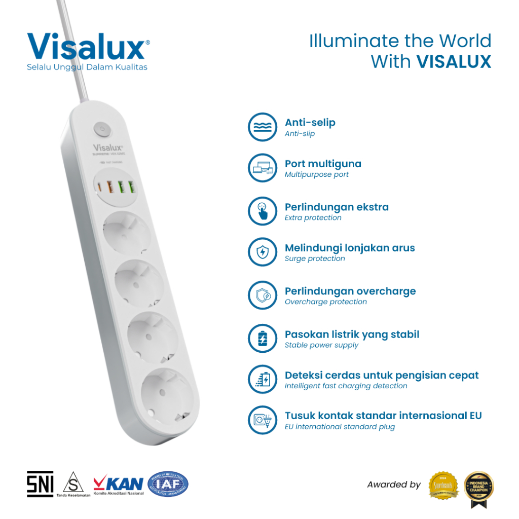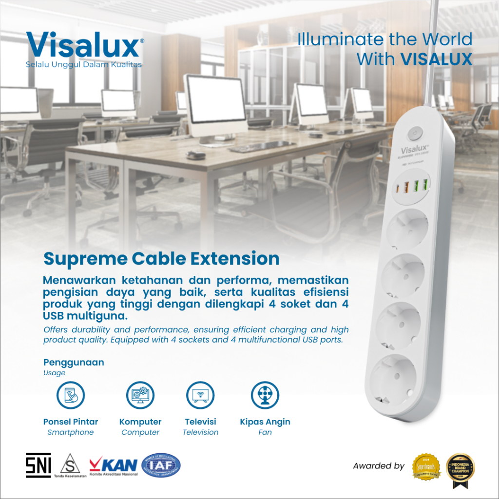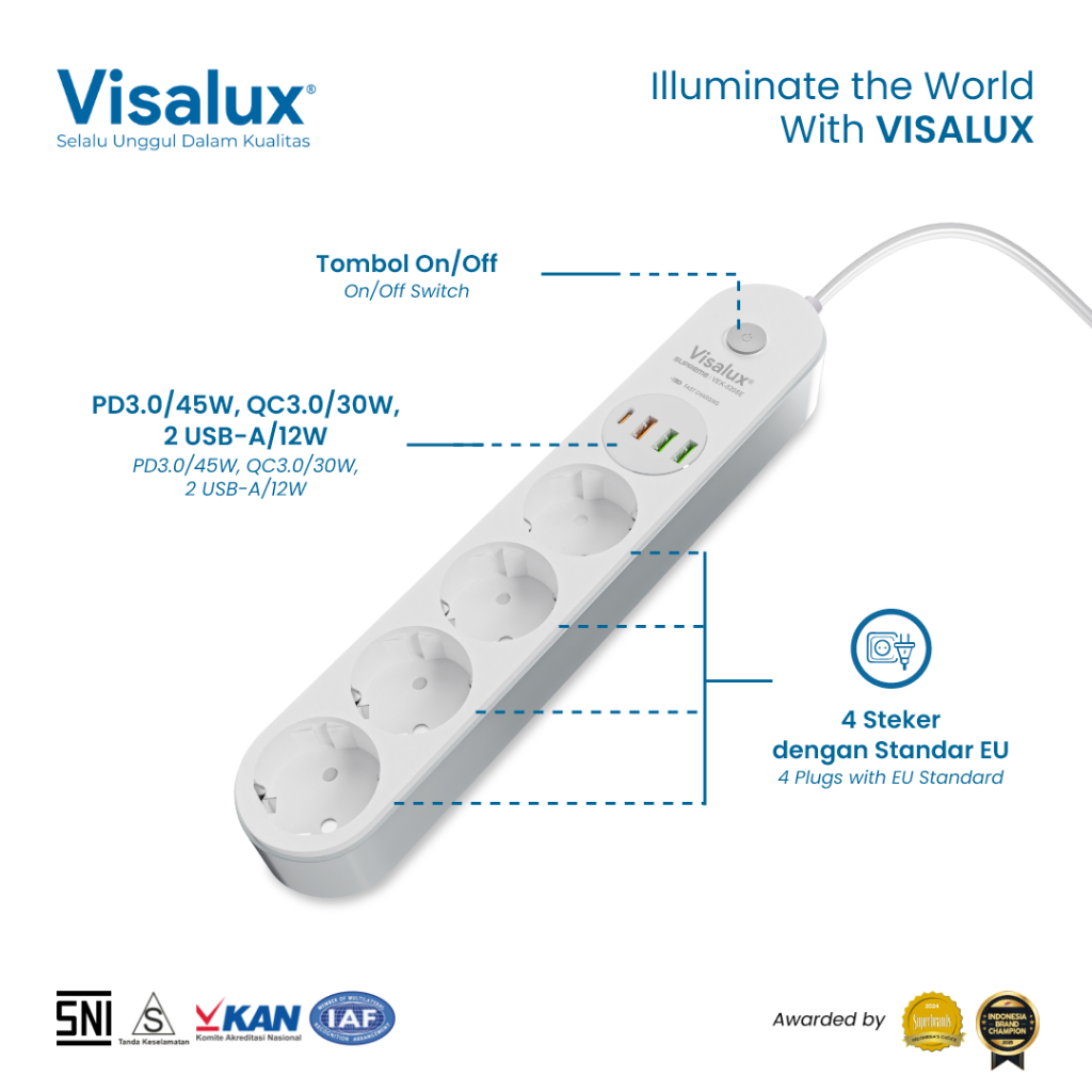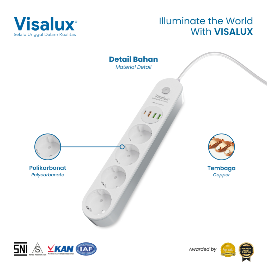 Visalux Kabel Extension with Power Button Supreme (2 Pin) - 4L + Type C + USB A Fast Charging (Stop Kontak Kabel 4 Luban