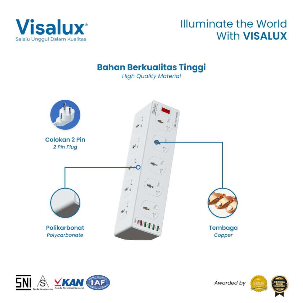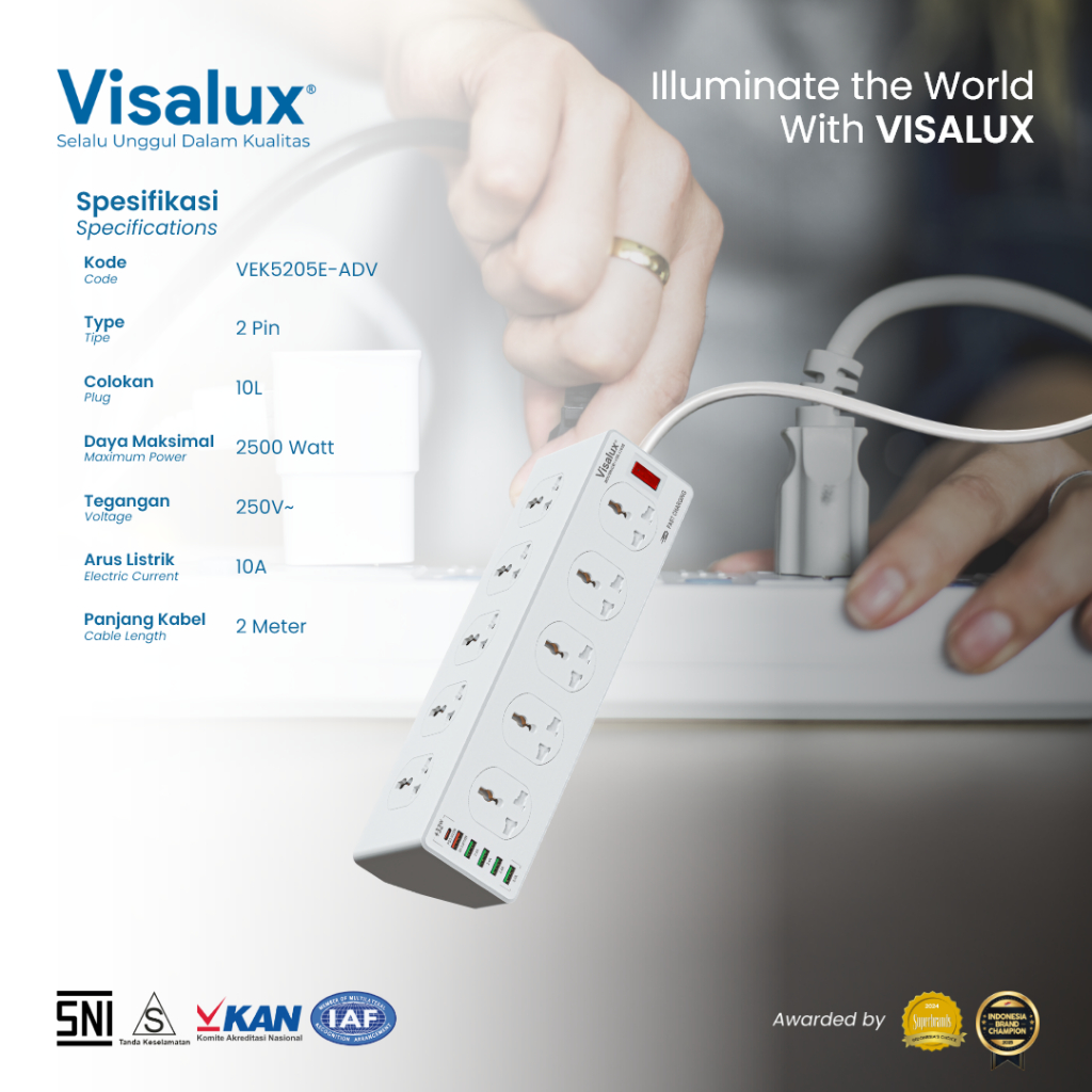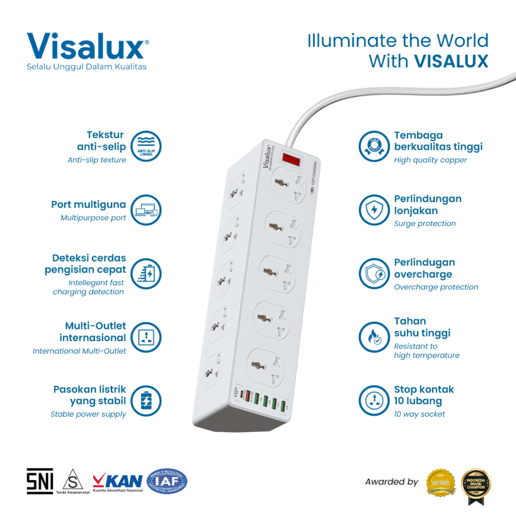 Visalux Kabel Extension with Neon Switch Advance (2 Pin) Type C + USB A Fast Charging - 10L (Stop Kontak 10 Lubang Colo