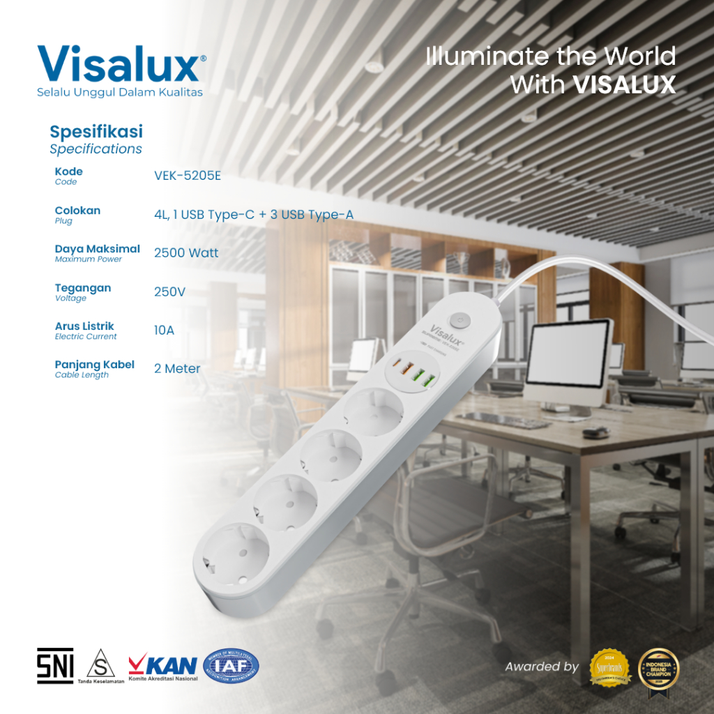 Visalux Kabel Extension with Power Button Supreme (2 Pin) - 4L + Type C + USB A Fast Charging (Stop Kontak Kabel 4 Luban