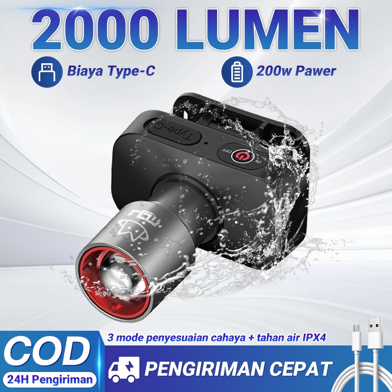 【Beli 1 gratis 1】Senter Kepala Zoom AK-3685A 200W Super Jarak Jauh Laser Terang Headlamp LED Zoom 2000 Lumen Tahan Air I