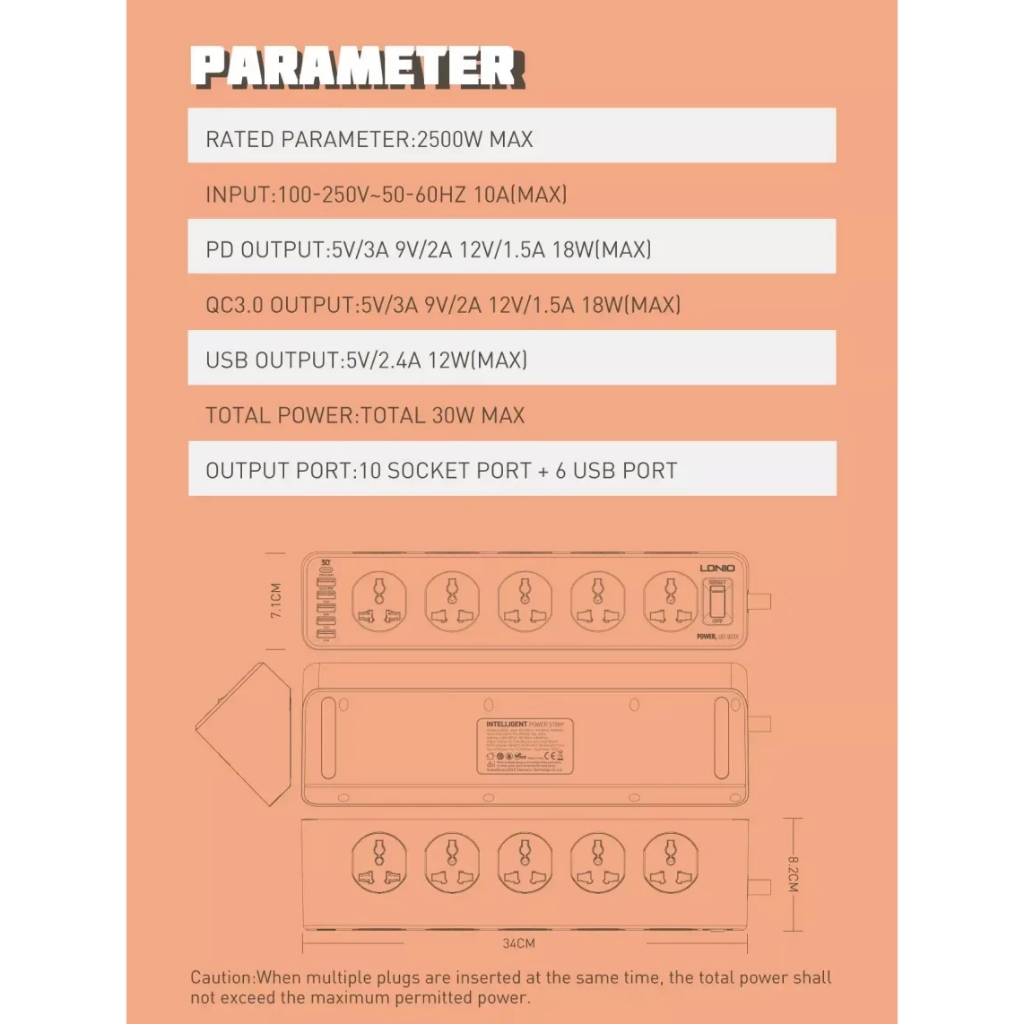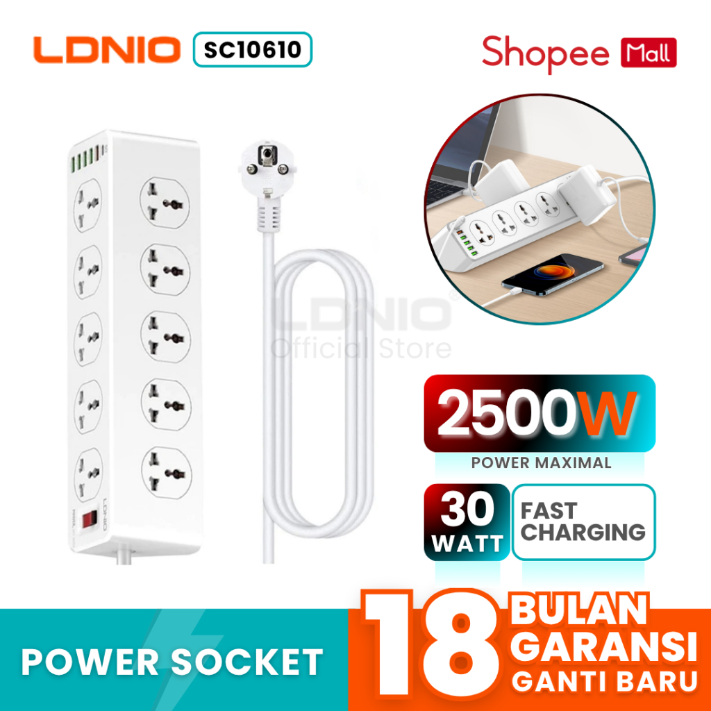 LDNIO SC10610 Stop Kontak 10 Outlets Power Socket 5 USB + PD QC 3.0 Garansi Resmi