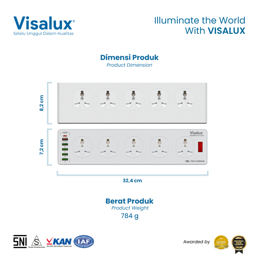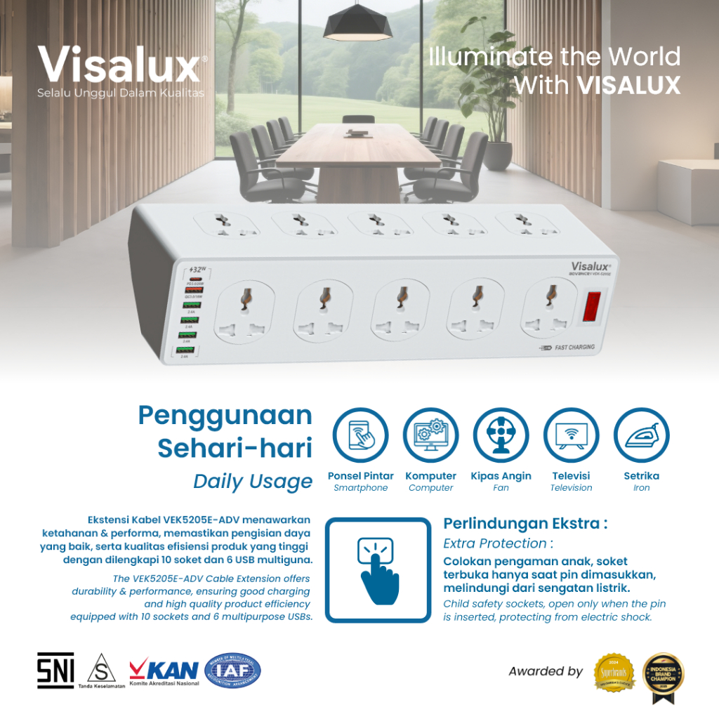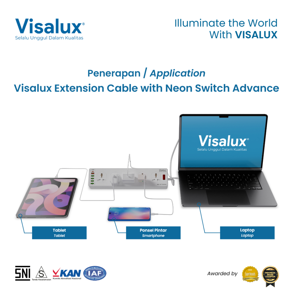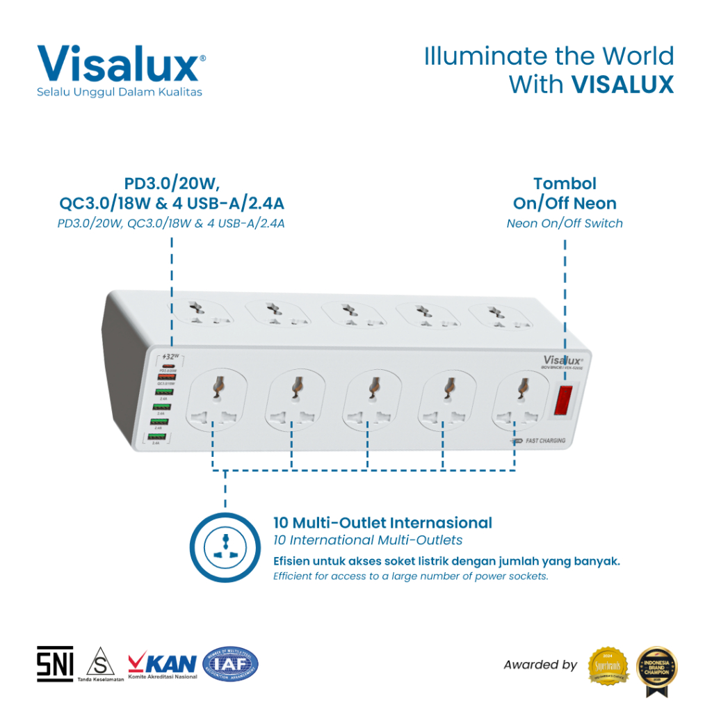 Visalux Kabel Extension with Neon Switch Advance (2 Pin) Type C + USB A Fast Charging - 10L (Stop Kontak 10 Lubang Colo