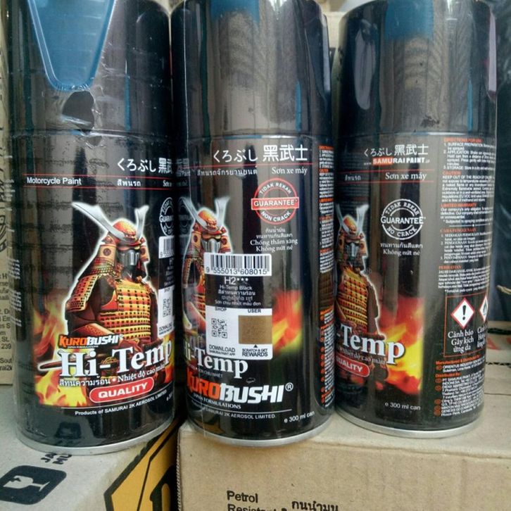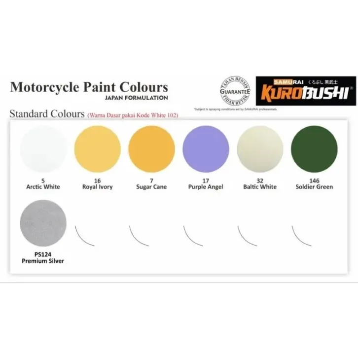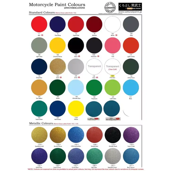 Red 6, Tivoli Blue 9, Signal Red 23, Maroon 38, White 102, Grey 104, Light Grey 106, Chrome Yellow 108, Black 109, Flat Black(Doff)109A, Pink 113, Light Scarlet 115, Deep Blue 116, Gold 123, Silver 124, Clear 128, Flat Clear(Doff)128A, Army Gren 142, Taxi Yellow 149, Green 162, Mikrolet Blue 164, Tropicana 165, Leaf Green 231, Blue 312, Tosca Green 322, Bell Flower 323, Yellow 1728, Light Blue 371, Ves Indigo Blue 2001, Arctic White 5, Royal Ivory 16, Sugar Cane 7, Purple Angel 17, Baltic White 32, Soldier Green 146, Premium Silver PS124